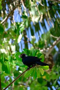 Zu sehen ist Asian Koel (Eudynamys scolopaceus). Das Sonnenlicht fällt genau auf sein rubinfarbenes Auge.