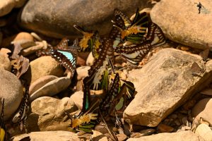 Eine Ansammlung tropischer Schmetterlinge, bei der Aufnahme mineralischer Salze, an einem Fluss in Borneo.