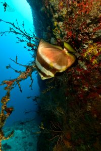 Ein Fledermausfisch (Platax teira), oft gesellig, hier aber mal einzeln an einer Riffwand.