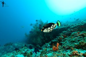 Der Leopardendrücker (Balistoides conspicillum) im Freiwasser. Einer der schönsten Drücker.