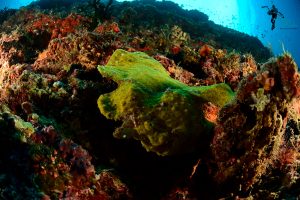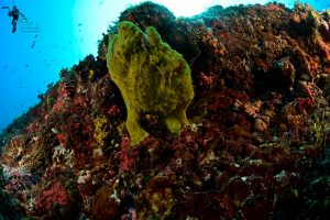 Der Rundflecken-Anglerfisch (Antennarius pictus) ist ein perfekter Tarnkünstler. Er verschmilzt mit den Schwämmen an einer Korallenwand.