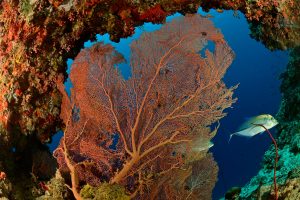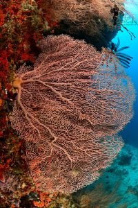 Riesenfächer-Gorgonie (Annella mollis) an einer Korallenwand.