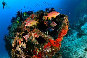 Eine Gruppe Großdorn-Husaren (Sargocentron spiniferum) an einem Wrack.