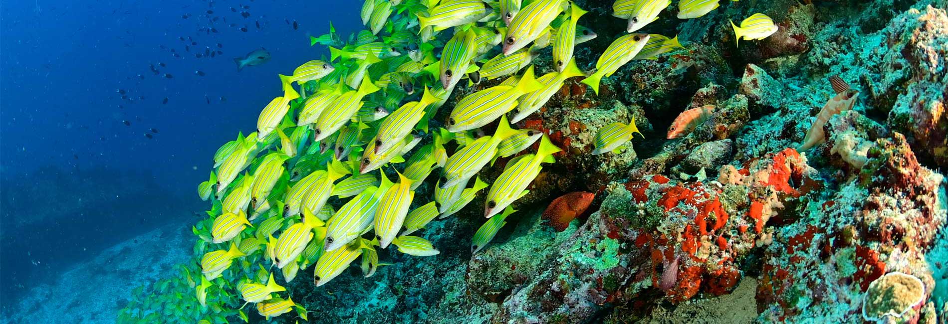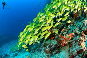 Ein großer Schwarm Blaustreifen-Schnapper (Lutjanus kasmira) in Unterwasserlandschaft.