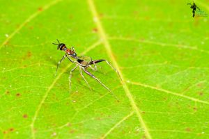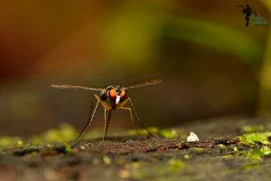 Eine langbeinige Fliege, die zur Familie der Raubfliegen gehört, beobachtet den Fotografen interessiert.