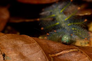 Zu sehen ist die Raupe des Lexias paradalis, der zu der Familie der Eisvögel gehört. Die Raupe kann mit ihren "Lanzen" Fress-Feinde, beispielsweise Ameisen auf Abstand halten.