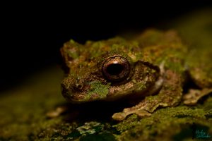 Ein gut an seine Umgebung angepasster Buschfrosch, auf einem völlig von Flechten und Moosen bewachsenem Blatt.