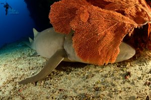 Schlafender Ammenhai (Nebrius ferrugineus) mit einer Fächerkoralle, die zu einer Schlafbrille “umfunktioniert” wurde.