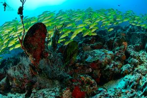 Ein großer Schwarm Blaustreifen-Schnapper (Lutjanus kasmira) in Unterwasserlandschaft.