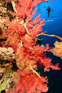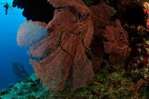 Riesenfächer-Gorgonie (Annella mollis) an einer Korallenwand.