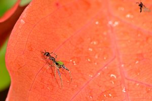 Eine herrlich bunte Springspinne (Orsima ichneumon). Der Hinterleib ahmt den Kopf einer Ameise nach. So kann sie sicher sein, von hinten nicht angegriffen zu werden.