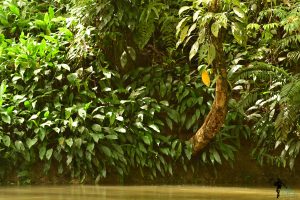 Ausschnitt eines Flussabschnitts mit üppigem Aglaonema-Bewuchs.
