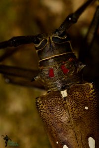 Kopf-Brust-Portrait eines großen Bockkäfers (Batocera thomsonii).
