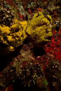 Der Rundflecken-Anglerfisch (Antennarius pictus) ist ein perfekter Tarnkünstler. Er verschmilzt mit den Schwämmen an einer Korallenwand.